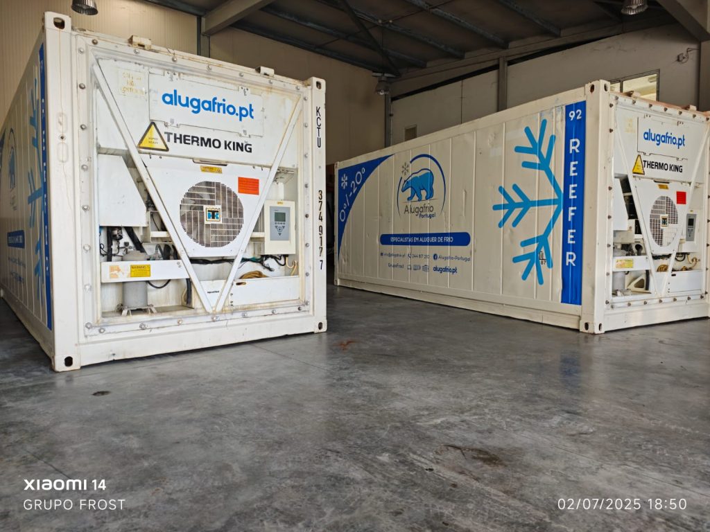 O Reefer da Alugafrio Portugal é uma câmara frigorífica robusta e industrial, ideal para armazenamento seguro de produtos paletizados ou individuais. Temperaturas controladas: de +20 °C a ‑20 °C, garantindo conservação de produtos sensíveis em qualquer operação. Equipamento Thermo King Marine com alimentação trifásica 380V, 32A.